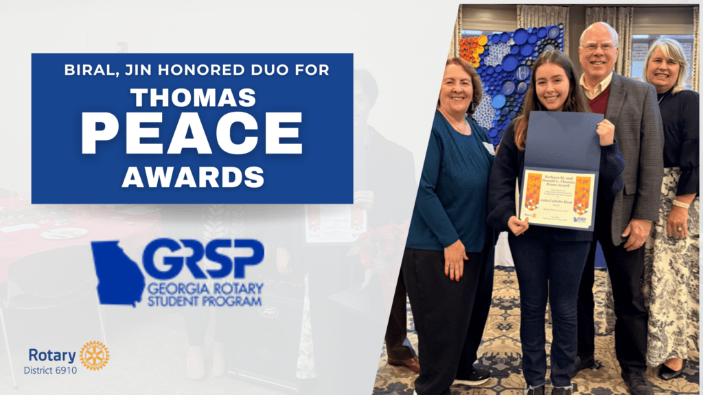 Julia Carlotto Biral of Brazil and Guang ‘Loski’ Jin of China were recently announced as the winners of the 2025-2026 Barbara M. and Donald L. Thomas Peace Award. The awards were presented in December by Rotary Club of Roswell Committee Chair John Carruth, alongside GRSP Executive Director Katheryne Fields and Past District Governor Cheryl Greenway.