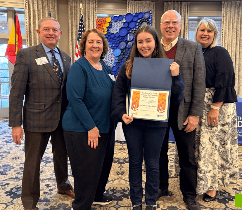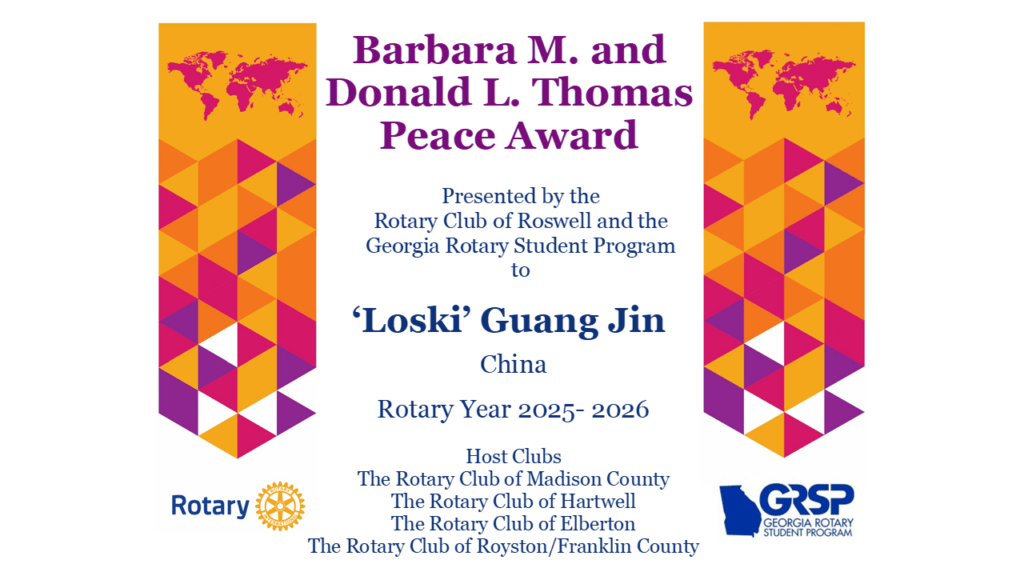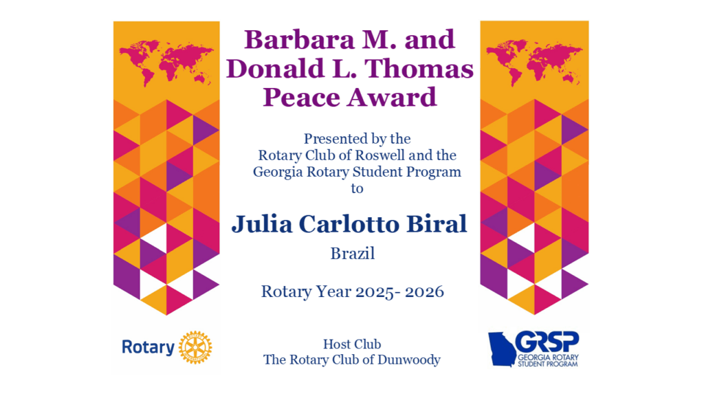 Julia Carlotto Biral of Brazil and Guang ‘Loski’ Jin of China were recently announced as the winners of the 2025-2026 Barbara M. and Donald L. Thomas Peace Award. The awards were presented in December by Rotary Club of Roswell Committee Chair John Carruth, alongside GRSP Executive Director Katheryne Fields and Past District Governor Cheryl Greenway.